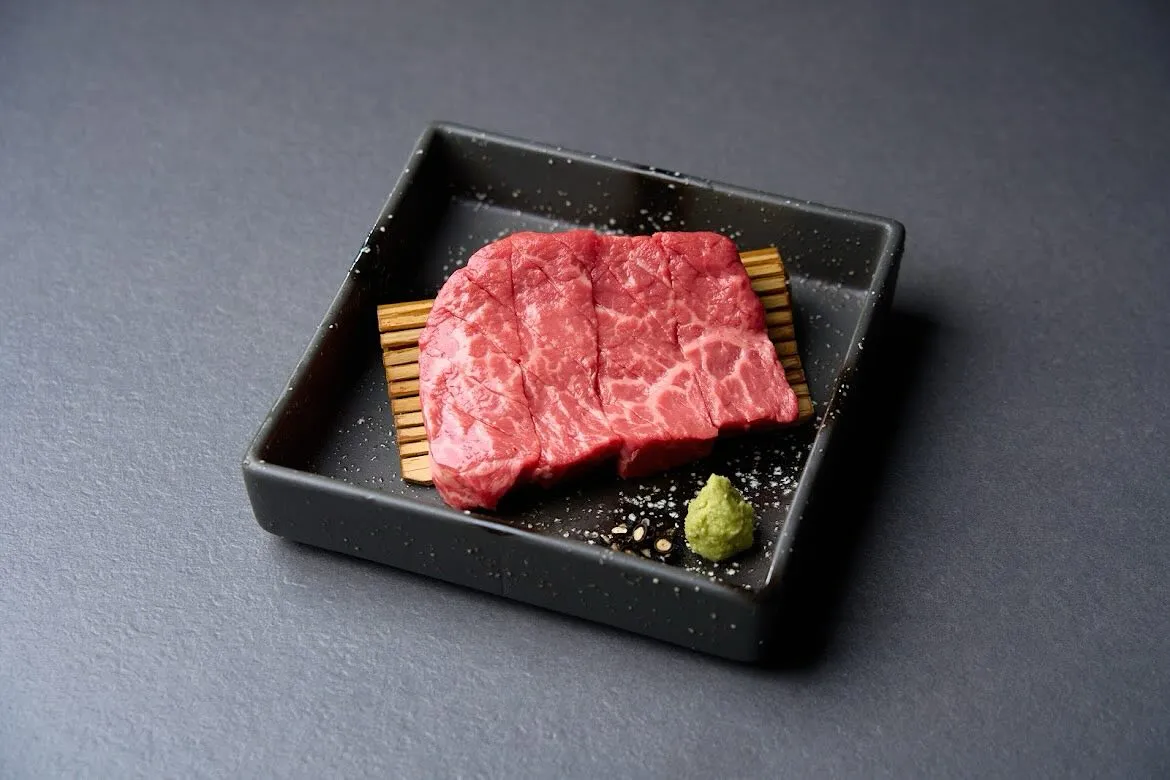 赤身のあっさりとした味わいを厚切りのステーキでお召し上がりください。薬味は生胡椒とポン酢とわさびです✨